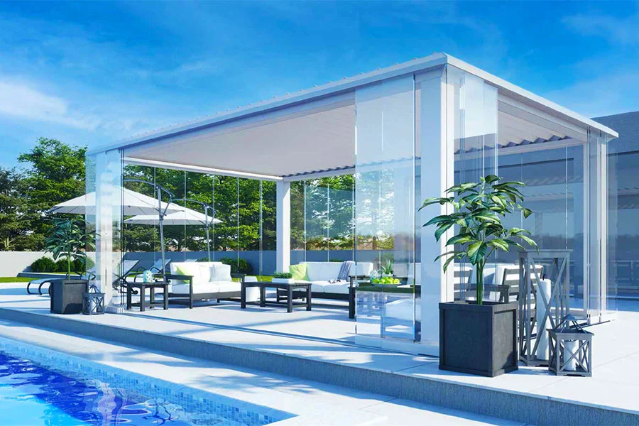 - Si adatta bene anche per i progetti di pergola bioclimatica con vetrate, per massimizzare i vantaggi di vivibilità outdoor ed efficienza energetica.